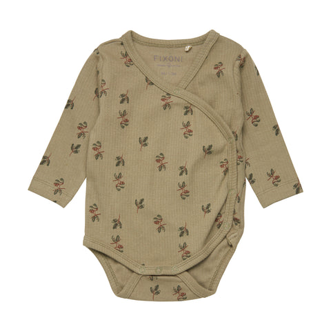 Lange mouwen rompertje van Fixoni met overslagsluiting en drukknoopjes. Ook drukknoopjes tussen de beentjes om makkelijk te verschonen. Het rompertje heeft een all-over print op een needle drop-stof. Gecertificeerd volgens GOTS – organic CERES-0366.