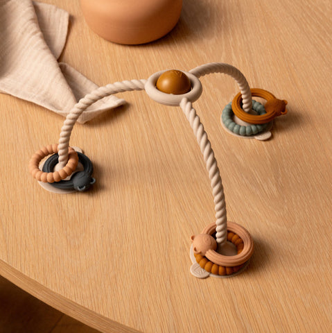 Met de zuignappen kun je de SOREN stevig op de tafel bevestigen. Dit sensorische speelgoed houdt kleine, nieuwsgierige handjes bezig tijdens de maaltijd. Laat je kindje de verschillende texturen en vormen ontdekken, terwijl de siliconen ringen op en neer bewegen en het midden een vrolijk rammelend geluid maakt.