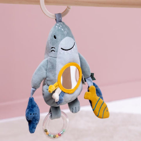 Vandaag gaat Mr. Shark overal mee naartoe. Met Mr. Dino en zijn rammelende kralenring, ritselpapier, kiekeboespiegeltje en grappige trekkoordjes is het altijd dolle pret. Dit speeltje stimuleert je kleintje en ontwikkelt de motorische, visuele en auditieve vaardigheden. Kers op de taart: je maakt Mr. Shark veilig vast aan je wandelwagen, winkelkarretje, autozitje of speelbox.