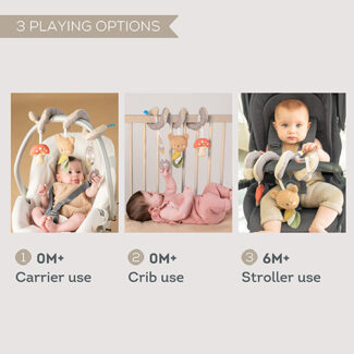 Zachte knuffelvriendjes, kleurrijke bijtringen en lieve rammelgeluidjes nodigen uit tot rustig spel en nieuwsgierige ontdekking tijdens elke wandeling of autorit.
