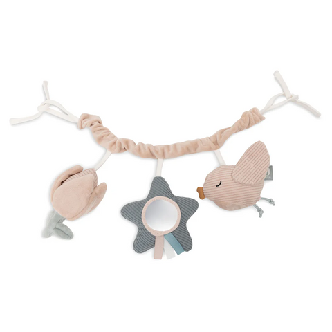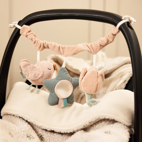 Deze schattige wagenspanner is een echte blikvanger voor in de kinderwagen en zorgt voor urenlang speelplezier! De drie lieve hangertjes – een tulp, een schattig vogeltje en een vogelhuisje met spiegel – maken het onderweg extra leuk voor je kleintje. De knispergeluidjes en vrolijke belletjes maken de wagenspanner helemaal compleet.