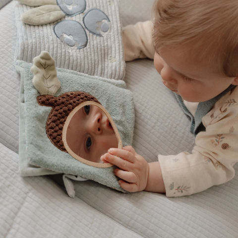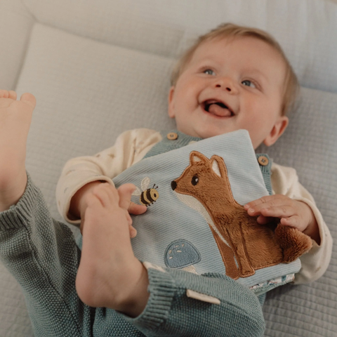 Je hoeft je niet te vervelen met dit kleurrijke activiteitenboekje van Forest Friends. Het lieve vosje nodigt je uit om een kijkje te nemen in het betoverende bos. Er valt veel te ontdekken met de verschillende texturen en activiteiten, zoals een spiegeltje, een rammelaar en verstopte speeltjes. Ook heeft het zachte boekje verschillende labels om aan te voelen. Dit boekje prikkelt niet alleen de zintuigen, maar is ook goed voor de ontwikkeling van de hand-oogcoördinatie.
