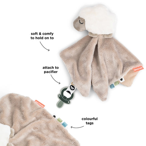 De klittenbandsluiting houdt een fopspeen altijd binnen handbereik, waardoor het ideaal is voor onderweg of tijdens het slapen gaan. In een zachte sandkleur komt dit doekje met Sheepy, die zorgt voor extra comfort en gezelschap. Of je nu thuis bent of op pad, dit lieve knuffeldoekje biedt je kleintje een gevoel van warmte en veiligheid.