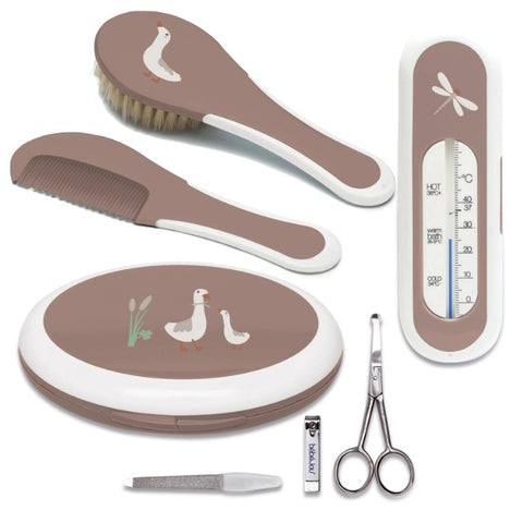 Een praktische verzorgingsset van bébé-jou om toekomstige ouders kado te geven. In deze set zit een kapset, manicureset en een badthermometer. Drie basisproducten die je nodig hebt voor een goede verzorging van je pasgeboren kindje.